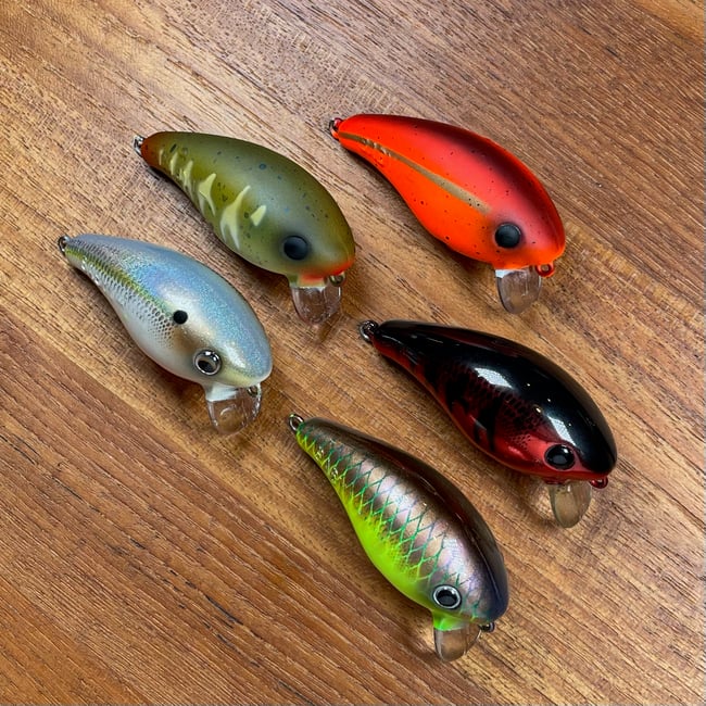 Set of OG Double Stamped Mann’s Baby 1-Minus—exclusive custom Bass Lab colors painted by TK Stanley at Tackle Kraft. These are first run made in America baits. They can be burned and run true. A must for cranking super shallow grass or wood due to its wide action and loud brass rattles. The Baby 1- is arguably the best super shallow crankbait ever made—and became popular after Dan Moorhead clinched a 1996 Bassmaster Top 100 win with this bait on the Potomac River. The set includes: Coppertreuse Gill, Hologram Sexy Shad, Candy Apple Craw, Matte finish Firecraw and Matte Finish Blue Crab—which also mimics a juvenile bluegill! Tight lines!